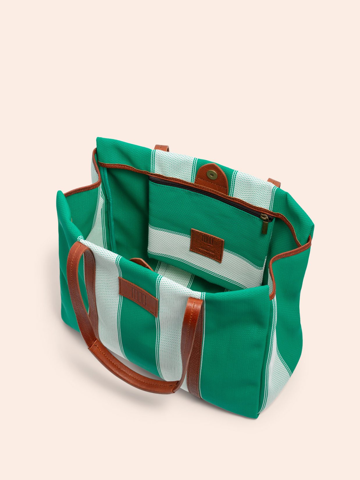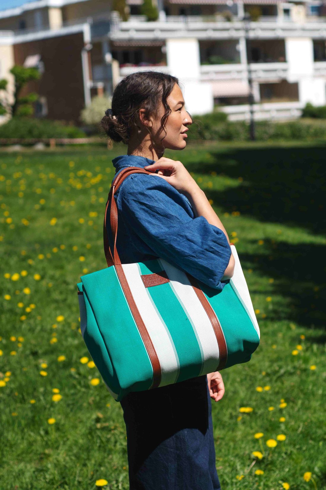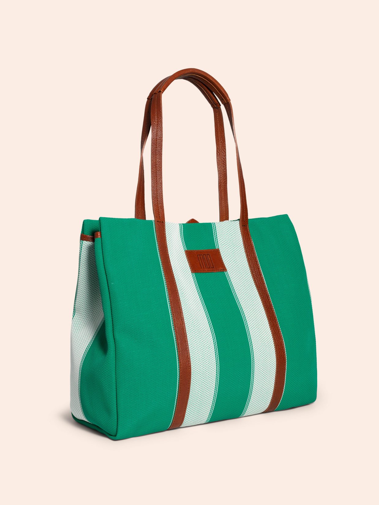 Elba Tote er en oppsirkulert tote som er laget av overskuddsmateriale (PVC) fra italiensk solseng produksjon. Vesken har 3 innvendige lommer. Skulderstroppene er av italiensk kalveskinn som blir myke og former seg etter din skulder ved bruk. Vesken lukkes enkelt med en magnetisk knapp.